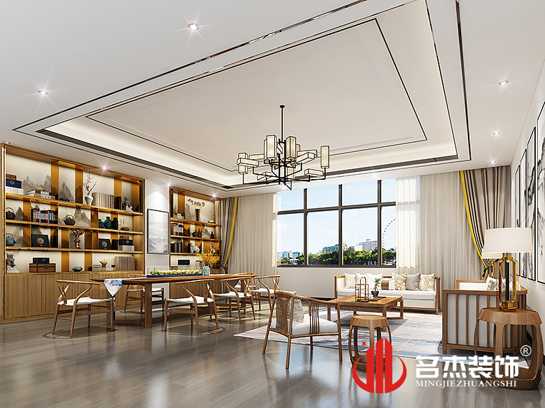 本案例是以辦公和服裝展示為主的服裝公司,設計師從眾多設計元素中挑選了較為流行的服裝設計元素,加入到設計當中。同時也根據實際情況,在吊頂設計部分采用了有造型的燈具,而且在前臺設計部分也采用了流行的弧形元素,增加整體設計感。