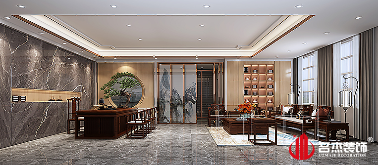 設(shè)計(jì)師在天花增加了層次起到了很好的區(qū)域劃分作用,從中式元素入手,通過(guò)有節(jié)制的極簡(jiǎn)設(shè)計(jì)來(lái)賦予空間中式典雅的魅力。辦公區(qū)域多處使用景觀的元素,也使得空間和傳統(tǒng)時(shí)尚簡(jiǎn)約風(fēng)格有著不一樣的特色。