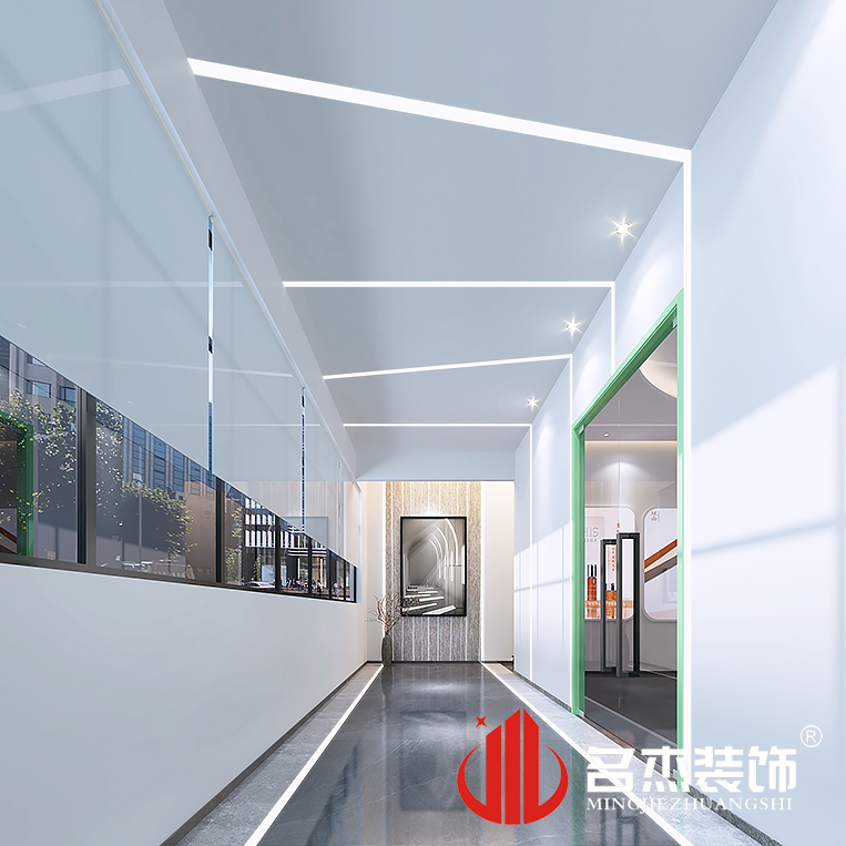 醫(yī)藥科技公司主要以白色為基調(diào),輔以莫蘭迪色系的綠色為點綴,視覺上面給人一種很舒適的感覺。展廳區(qū)域利用多種不規(guī)則的形狀,使得整個辦公室裝修設(shè)計空間都處在時尚潮流的氛圍當(dāng)中。整體柔和的線條,給人一種不一樣的視覺感受。