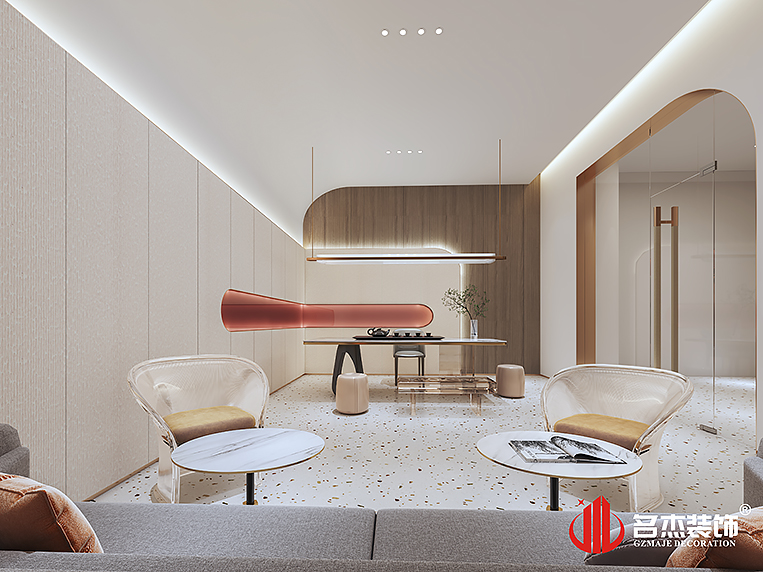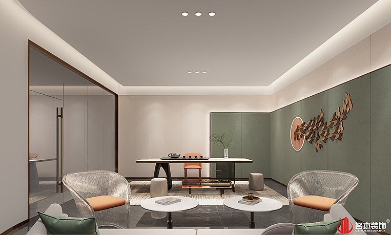在前臺(tái)區(qū)域使用圓頂造型的天花來(lái)作為整個(gè)辦公室裝修設(shè)計(jì)空間的點(diǎn)睛之筆,同時(shí)配波浪板的背景墻,讓人有一種仿佛置身大海一般。在接待室里面選擇性地使用圓弧線(xiàn)條,加以莫蘭迪色系以及護(hù)墻板的,燈帶的恰到好處地使用,讓接待室的休閑感和柔和感更加濃郁。而在另一個(gè)接待室則是采用不一樣的設(shè)計(jì)處理手法,以直的元素作為主打元素,同時(shí)也搭配莫蘭迪色系作為點(diǎn)綴色系,也更突出空間的休閑感。