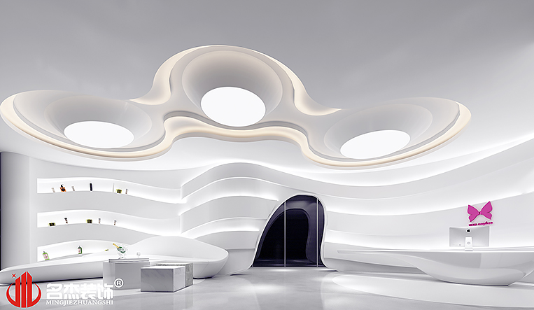 考慮到展廳為主,所以使用大量的弧線來作為整個辦公室裝修風格的主要元素,利用線條和弧線來打造一種流線美的美學,與企業(yè)的核心業(yè)務美容做一個呼應。