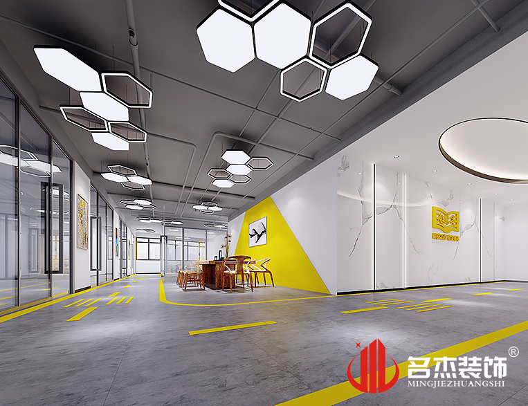 整個辦公室裝修設(shè)計空間采用的是時尚簡約的風(fēng)格,大面積的黃色色塊的加入,讓空間中不再單調(diào)的同時也增加了幾分時尚感。前臺使用大理石條紋的背景墻,加以圓形的吊頂造型,搭配出不一樣的時尚感。