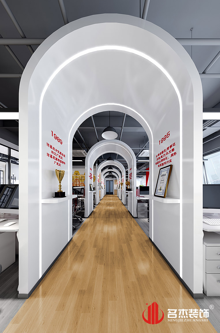 在前臺(tái)裝修設(shè)計(jì)的時(shí)候,燈帶的加入讓空間中充滿了不一樣的設(shè)計(jì)感,而且在辦公區(qū)域的過(guò)道旁邊,加入了時(shí)光隧道的設(shè)計(jì)元素,讓整個(gè)企業(yè)的發(fā)展歷程都能隨時(shí)讓人看見(jiàn),企業(yè)文化也不知不覺(jué)中融入到整體的環(huán)境中。