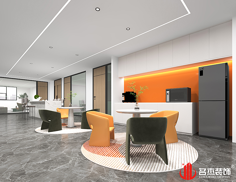 整體辦公空間裝修設計當中使用橙色作為空間的點綴色,讓空間能夠抓人眼球的元素,同時還可以提高辦公室裝修設計空間的層次感。休閑區(qū)也使用了較為傳統(tǒng)的元素進行裝修設計,加入亮眼的橙色作為點綴色,可以讓員工得到放松。