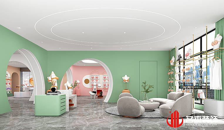 在前臺(tái)區(qū)域使用線條和弧形元素來(lái)增加空間的設(shè)計(jì)層次感,同時(shí)在整體設(shè)計(jì)當(dāng)中加入了莫蘭迪色系作為點(diǎn)綴元素,讓空間的設(shè)計(jì)層次感再次得到提升。不同子品牌采用的是不同的顏色,這樣容易讓大眾更好的識(shí)別,同時(shí)賦予子品牌不一樣的活力,再加上不同于常規(guī)造型的門(mén),突出想要做出別樣的裝修設(shè)計(jì)風(fēng)格。