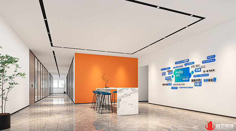 時尚簡約風格為這次的主打風格,同時加入活力橙作為空間的點綴色,讓其空間與市面流行的辦公裝修設計空間有著明顯的區(qū)別?;盍Τ鹊募尤胍材転榭臻g注入更多的活力元素,使其空間變得更加有趣。#廣州辦公室裝修設計#