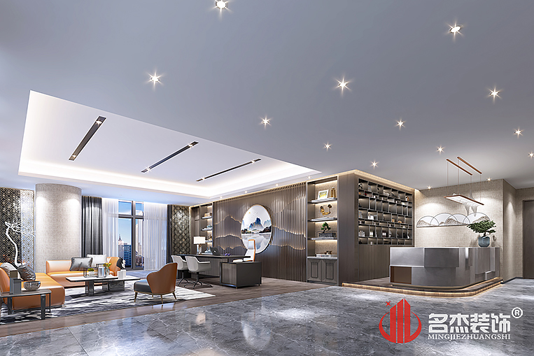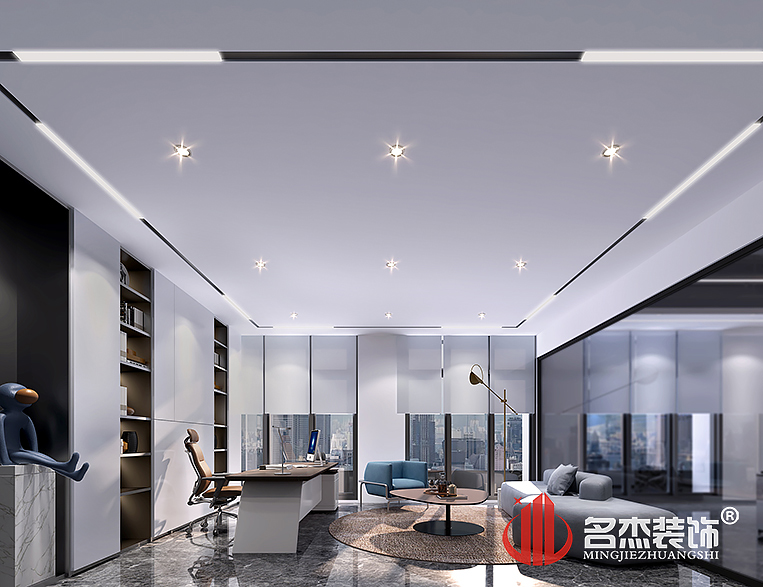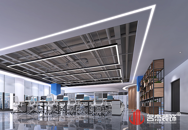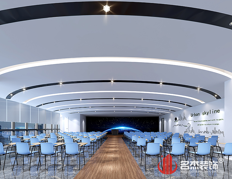 考慮到企業(yè)是為客戶提供專業(yè)的咨詢服務,整體設計運用了藍色燈帶來襯托出滿滿的科技感,以及圓弧形元素能夠讓整個辦公室裝修設計空間表現(xiàn)力更強。運用圓形穹頂使得整個培訓室看起來更加的大氣。