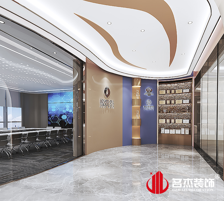 整個辦公室裝修設(shè)計在各個區(qū)域都使用設(shè)計感強(qiáng)烈的元素,從天花到玻璃隔斷,每處都能看到弧形元素的加入,合理運(yùn)用這設(shè)計元素能夠讓空間更加有層次感。熱彎玻璃的加入是可以讓整體動線更加合理,而且還可以讓企業(yè)的元素得到更好的發(fā)揮。