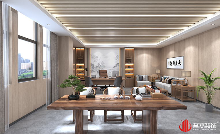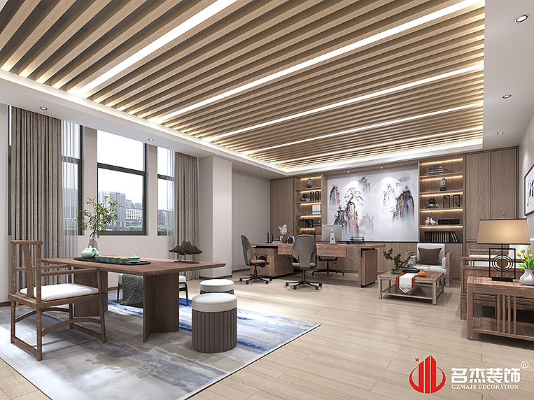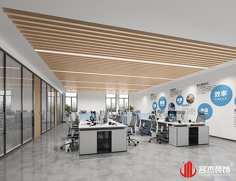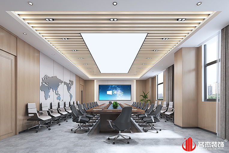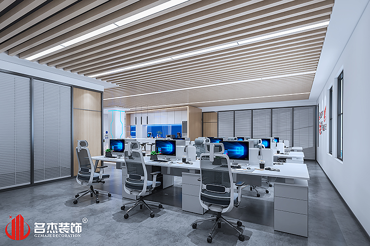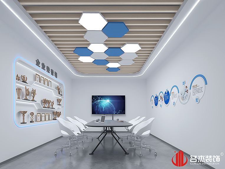 由于該行業(yè)是屬于高新科技行業(yè),設(shè)計團隊在整個辦公室裝修設(shè)計空間加入木色的吊頂,讓空間的格調(diào)不再屬于冷色調(diào),同時在部分區(qū)域加入科技的元素,響應(yīng)出該行業(yè)的科技屬性。在展廳區(qū)域則是特意使用上多邊形的木色吊頂,沿著動線來構(gòu)造,形成一種呼應(yīng)。