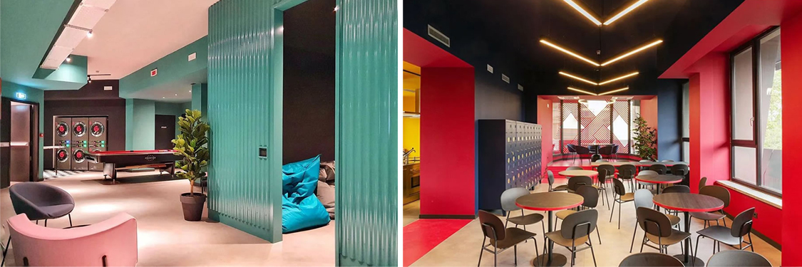 公共區(qū)域的家具采用的是標志性的元素和意大利生產(chǎn)的桌椅,這里面也有很多定制的元素,都是可以滿足各個空間的需求和靈活使用的專門開發(fā)的,每一個元素,都能夠感受到色彩、飾面和形式上的仔細推敲和精美呈現(xiàn)。對于細節(jié)和色彩的縝密研究不僅僅是在家具上面,還體現(xiàn)在整體配色和建筑的飾面上,使用跳躍的顏色和柔和的顏色進行對比、硬質(zhì)和軟質(zhì)材質(zhì)之間的對比、自然肌理和鏡面材質(zhì)之間的對比。CX Turin Regina的目的是為每個客人創(chuàng)造出一個熟悉且有安全感的空間范圍。每個學(xué)生都擁有一間視野開闊的單人房,以及可供長期住宿的所有舒適設(shè)施。